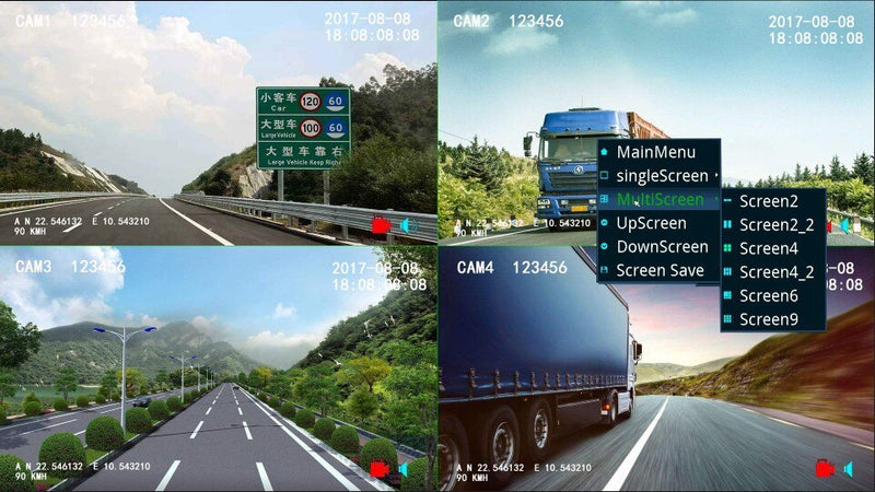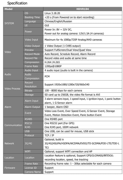 Alarm trigger: video loss alarm, overspeed alarm, collision alarm, storage space alarm, motion detection, remote control alarm